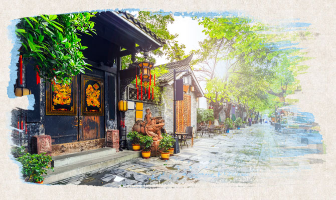 曾是西蜀歷史上最古老、最具有商業氣息的街道,早在秦漢三國時期以織錦、售錦聞名。古街青瓦錯落有致,青石板路蜿蜒前行,恍若時空倒流。全長350米,採用清末民初的古鎮建築風格,與武侯祠博物館現存清代建築的風格相融,讓遊人享盡原汁原味的四川古味。