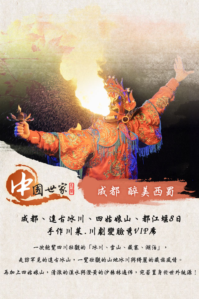 川劇變臉秀包含了西蜀文明。變臉、吐火、滾燈馳名中華,杖頭木偶鬼斧神工、技藝精妙;女兒清音絲絲入扣,不可言傳。聽古琴撥動,不覺夢回三國。聞二胡聲起,換了浮雲蒼狗。絕跡多年的手影戲,重返民間;鼓樂齊鳴盪氣迴腸,喜樂無限。