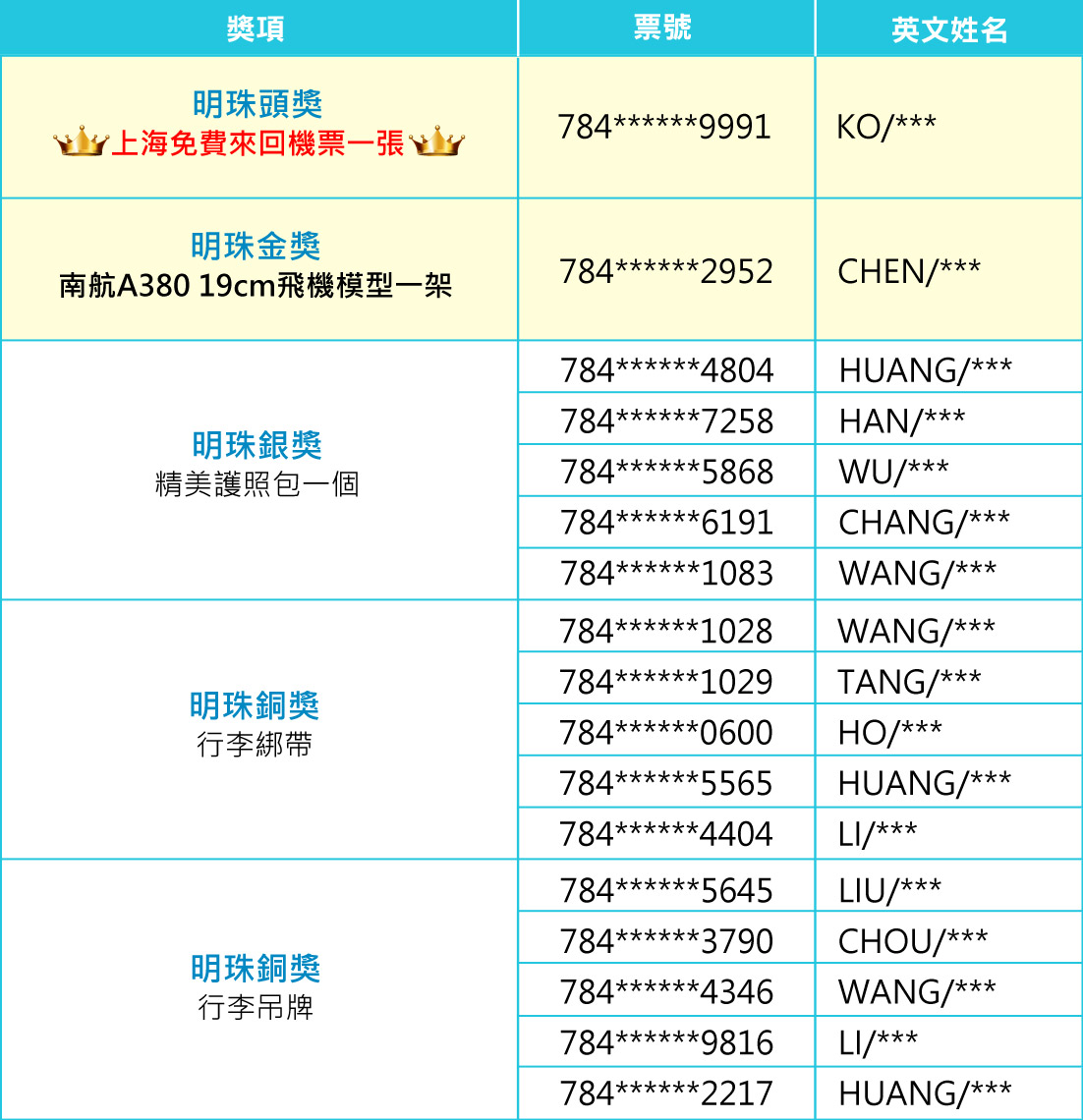- 1.搭乘班機者限台澎金馬居民且年滿18歲以上成人,每人各獎項限中獎一次。中國南方航空保有因任何航班調度、